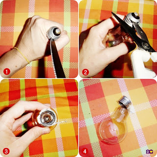 Tire o fundo de metal (já cortado) e retire a parte interna da lâmpada** (os fiozinhos queimados).